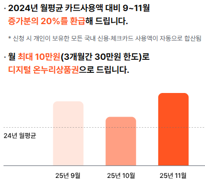예를 들어, 2024년 월평균 카드 사용액이 100만 원이고 2025년 10월 사용액이 130만 원이라면, 증가분 30만 원의 20%인 6만 원이 환급됩니다.