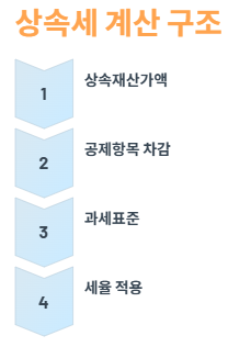 상속재산가액 – 공제항목(기초공제, 배우자공제 등) = 과세표준 → 세율 적용