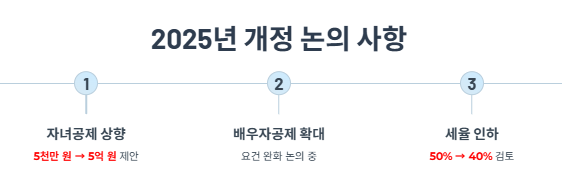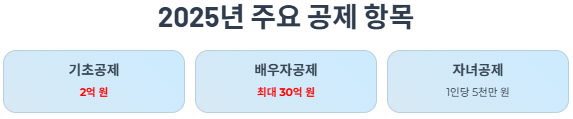 따라서 2025년 현재는 기초공제 2억 원, 배우자공제 최대 30억 원, 자녀공제 1인당 5천만 원 체계가 그대로 적용되고 있습니다.
