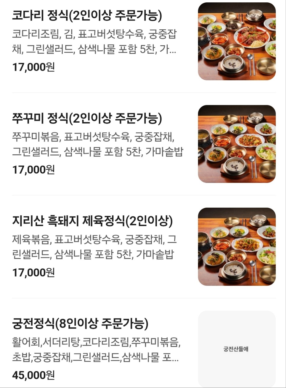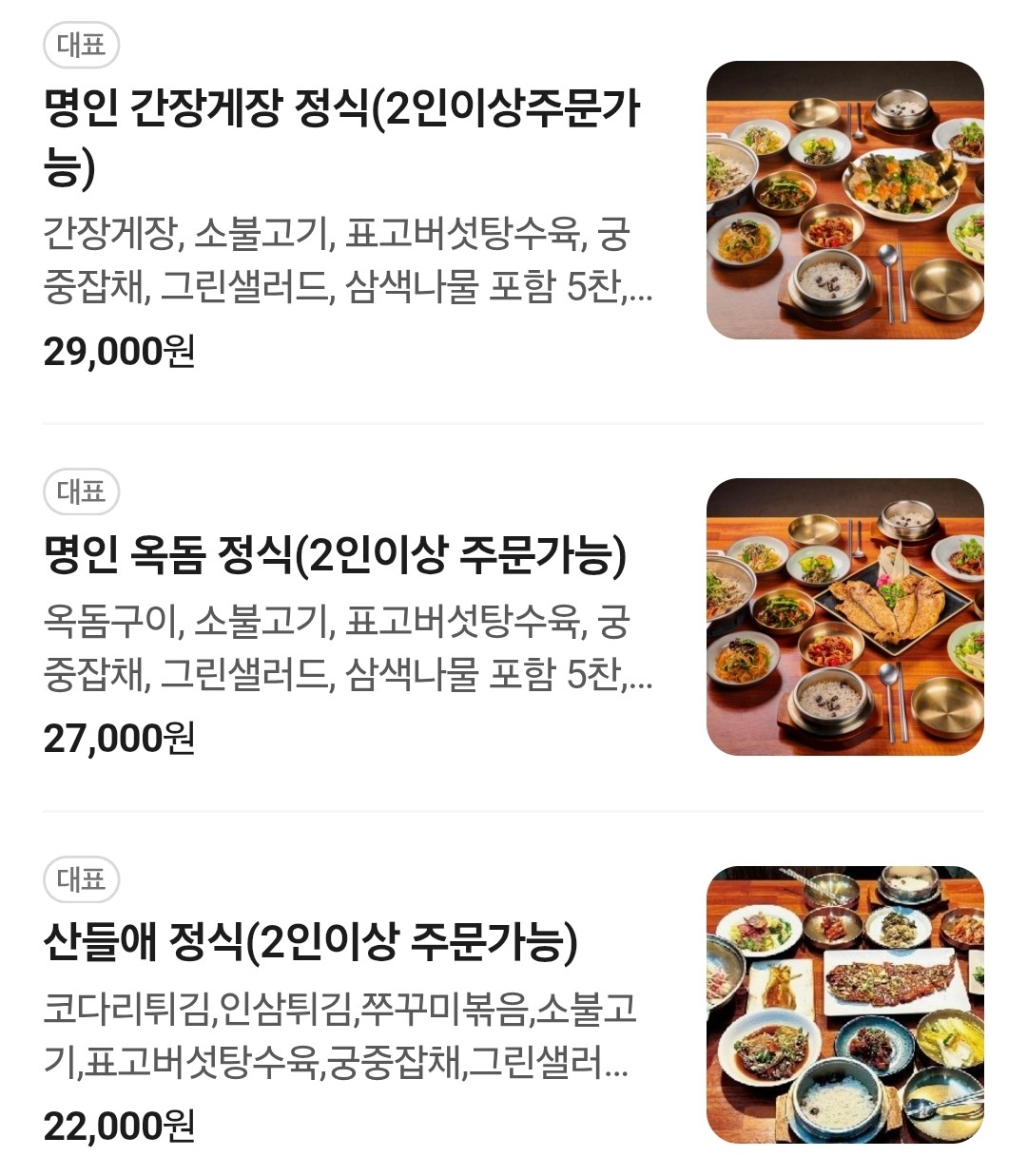 궁전산들애는 간장게장 정식 외에도 다양한 정식 메뉴를 갖추고 있어 방문객들의 선택 폭을 넓혀줍니다. 각각의 메뉴는 명인의 손맛과 정성이 깃들어 있어, 취향에 따라 골라 먹는 재미가 있습니다.