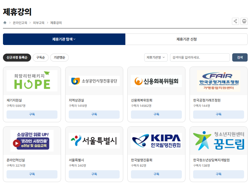 - 제공기관별 교육과정 목록을 확인하고, 관심 있는 과정을 선택합니다.
