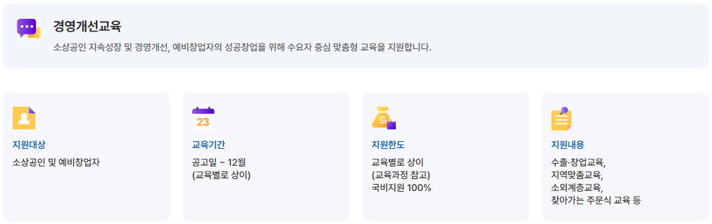 - 경영, 세무, 마케팅, 온라인 진출 등 소상공인 경영에 필요한 전 분야의 강의를 제공합니다.