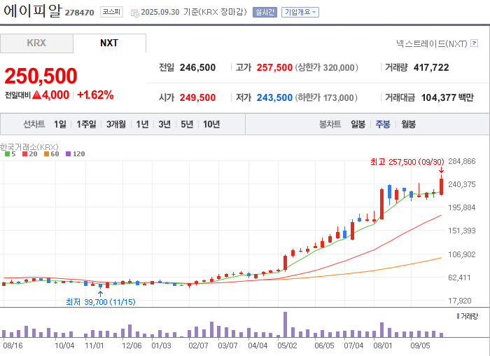 2025년 9월 30일 기준 주가는 250,000원으로 거래를 마쳤으며, 전일 대비 +1.42% 상승(+3,500원)했습니다. 최근 1년 수익률은 +383%를 기록하며 가파른 상승세를 이어가고 있습니다.