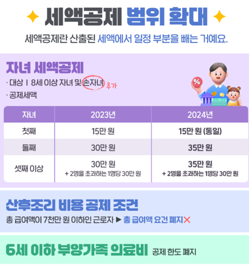 자녀 세액 공제도 2024년도부터 확대되었습니다. 자녀 수에 따라 공제액이 더 커졌습니다.