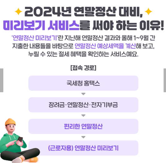 연말정산을 준비하는 가장 효율적인 방법 중 하나는 국세청의 연말정산 미리 보기 서비스를 활용하는 것입니다. 이 서비스는 직장인들이 자신의 예상 세액을 미리 계산하고, 세액공제를 어떻게 최적화할 수 있을지 안내해 줍니다. 이 서비스는 홈택스에서 제공되며, 1~9월까지의 카드사용내역과 의료비, 기부금 등의 정보를 바탕으로 예상 세액을 추정할 수 있습니다.