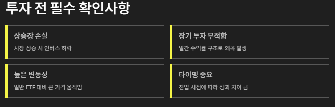 인버스는 구조를 이해하지 못한 채 투자하면 예상보다 큰 손실로 이어질 수 있습니다. 특히 다음 요소는 반드시 점검해야 합니다.