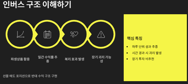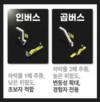 투자자들이 자주 혼동하는 개념이 곱버스입니다. 이는 하락률의 2배를 추종하는 상품으로 수익 가능성이 큰 만큼 위험도 함께 확대됩니다.