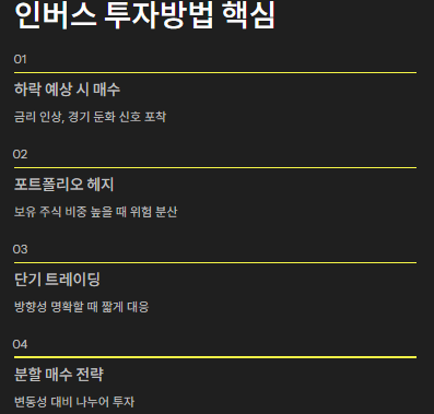 가장 효과적인 방법은 인버스를 예측 수단이 아니라 위험 관리 전략으로 활용하는 것입니다. 자신의 투자 목적과 시장 상황을 함께 고려한다면 보다 안정적인 포트폴리오를 구축하는 데 도움이 될 것입니다.