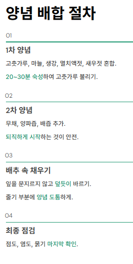 - 양념은 1차(핵심 양념) → 2차(수분·점도 조절) 방식으로 나누어 준비