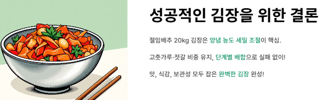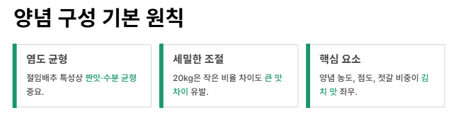 절임배추 20kg은 절임 과정이 생략된 상태이기 때문에 양념의 짠맛·수분·점도 조절이 생배추 김장보다 훨씬 중요합니다. 배추 자체에 염도가 남아있어 양념이 과하면 짜지고 적으면 김치가 밋밋해지므로, 아래 수치를 기준으로 맞추면 가장 안정적인 맛과 보관성을 확보할 수 있습니다.