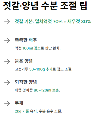 - 젓갈 기본 구성은 멸치액젓 70% + 새우젓 30% 비율이 가장 안정적