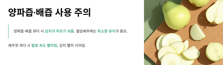 - 양파즙·배즙은 많을수록 김치가 무르므로 절임배추에는 최소량 유지
