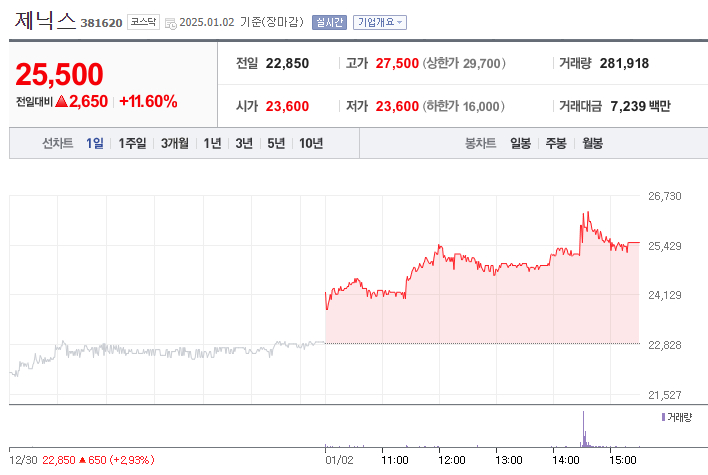 최근 제닉스는 삼성전자와의 협력 강화 소식에 힘입어 주가 상승세를 보였습니다. 제닉스의 주가는 2025년 1월 2일 오후 2시 현재 전 거래일보다 10.07% 상승한 25,150원에 거래되고 있습니다. 이는 제닉스의 기술력과 삼성전자의 전략적 투자 효과를 반영한 결과로 볼 수 있습니다. 주가는 제닉스의 물류용 자율주행로봇 공급 확장과 함께 긍정적인 시장 반응을 얻고 있습니다.
