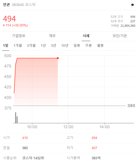 최근 인콘 주가는 단기간에 강한 상승 탄력을 보이며 시장의 주목을 받고 있습니다. 특히 장중 매수세가 급격히 유입되면서 상한가에 근접하는 움직임이 나타났고, 거래량 역시 평소 대비 크게 증가했습니다.