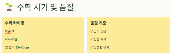 파종 후 40~60일이 지나 잎이 25~30cm 자라면 수확 시기로, 잎이 짧고 진한 녹색을 유지할 때 품질이 가장 좋습니다.