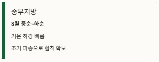 - 중부: 8월 하순까지 / 남부: 9월 초순까지 가능