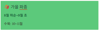 - 가을 파종 시기: 8월 하순~9월 초 / 수확: 10~11월