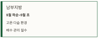 - 남부지방: 8월 하순~9월 초 / 고온·다습기 배수 관리 중요