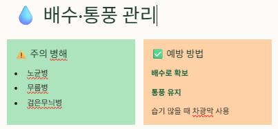 비가 자주 오는 시기에는 배수로를 확보하고, 습기가 많을 때는 일시적으로 차광막을 덮어 통풍을 유지하는 것이 좋습니다.