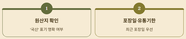 - ① 원산지 확인: 상품 라벨에 ‘국산’ 표기가 명확히 되어 있는지 반드시 확인합니다.