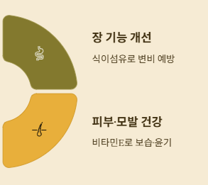 - 장 기능 개선: 식이섬유가 풍부해 장운동을 촉진하고 변비 예방에 효과적입니다.
