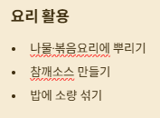 - 통깨를 나물무침, 볶음요리, 생선구이에 뿌려 고소한 풍미를 더합니다.