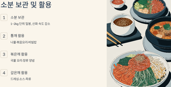- 볶은깨: 국물 요리·장류 양념에 활용