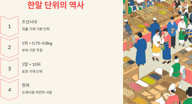 현재는 kg으로 전환되었지만, 여전히 농산물 경매시장에서는 “1말 단위 단가”가 함께 표시됩니다.