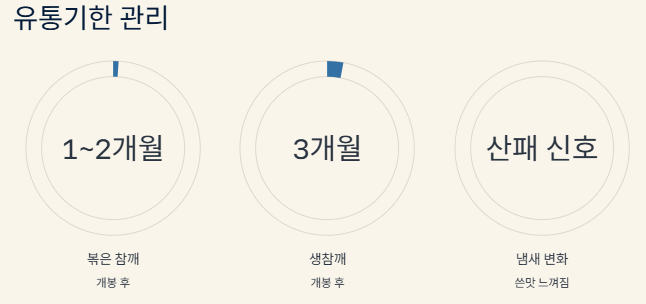 - 개봉 후 볶은 참깨는 1~2개월, 생참깨는 3개월 이내 섭취를 권장합니다.
