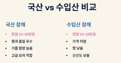 → 수입산은 가격이 저렴하지만 향과 신선도가 낮고, 국산은 기름 함량과 향이 풍부해 고급 요리에 적합합니다.