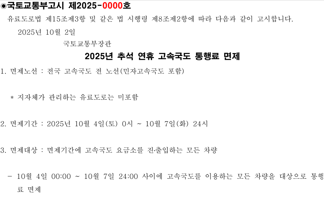 국토교통부 고시 제2025-0000호 (추석 연휴 고속국도 통행료 면제)