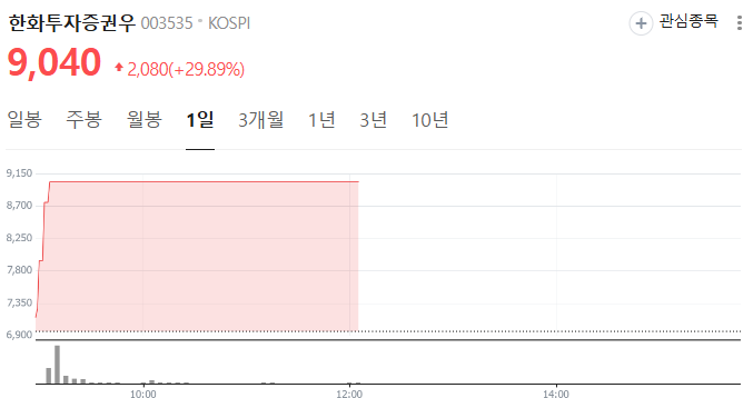 - 우선주(003535)는 이날 거의 상한가에 도달하며 +29.89% 급등, 대규모 매수세가 집중된 모습입니다.