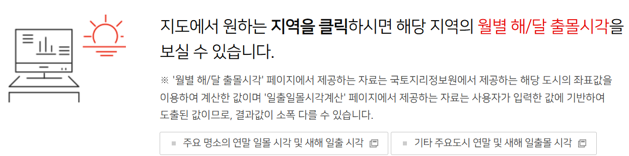 날짜와 지역을 직접 입력하면 좌표 기준으로 정확한 일출·일몰 시각을 확인할 수 있으며, 해돋이 여행 일정 수립 시 가장 많이 활용되는 공식 자료입니다.