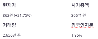 - 현재가 : 862원 (+21.75%)