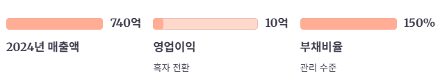 2024년 기준 매출은 740억 원, 영업이익은 약 10억 원으로 흑자 전환했습니다.