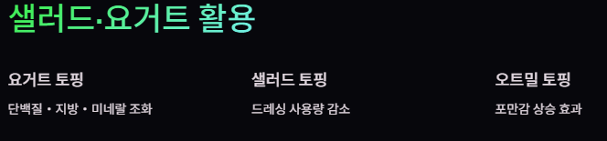 샐러드에 뿌려 먹으면 고소한 맛이 더해져 드레싱을 많이 쓰지 않아도 되고, 다이어트 식단의 만족도를 높여주는 역할을 합니다.