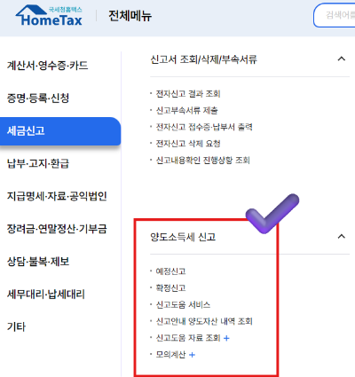홈택스 양도소득세 바로가기