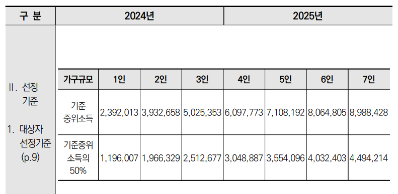 - 1인 가구: 2,392,013원 → 1,196,007원 이하