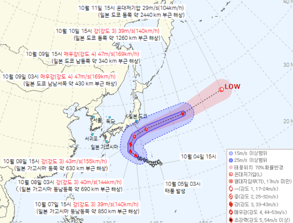 - 10월 11일 이후: 도쿄 동쪽 해상 통과 후 북동 방향 이동, 열대저기압으로 전환