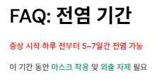 증상 시작 하루 전부터 5~7일간 전염 가능성이 있습니다. 이 기간 동안은 마스크 착용 및 외출 자제가 필요합니다.