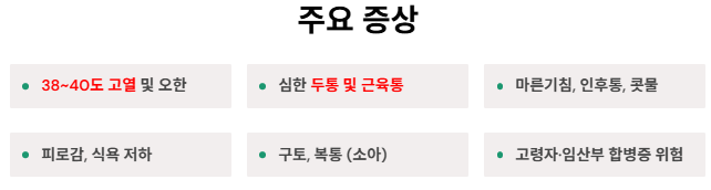 고열이 지속되거나 기침, 근육통이 심한 경우 반드시 내원해야 하며, 특히 고령자·영유아·임산부는 조기 진료가 권장됩니다.