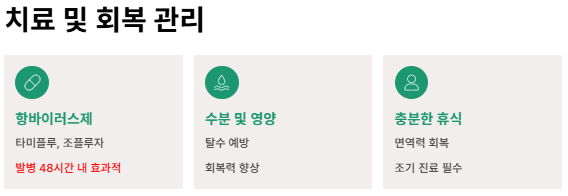 - 항바이러스제 복용: 타미플루, 조플루자 등 (발병 48시간 이내 복용 효과적)
