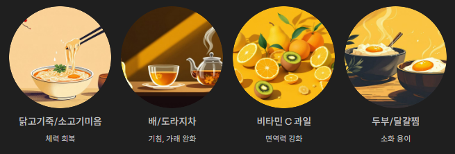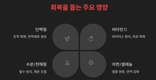 - 단백질: 손상된 조직 회복과 면역세포 생성에 도움 (닭고기, 달걀, 두부 등)