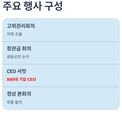 - CEO 서밋(CEO Summit) – 10월 29일~30일: 글로벌 기업 CEO와 정책 리더 참여