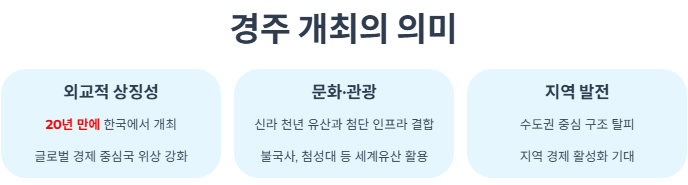 경주는 한국의 고도(古都)이자 세계문화유산도시로, 신라 천년의 유산과 첨단 인프라가 조화를 이루는 도시입니다. 이러한 역사적 상징성과 현대적 회의시설이 결합되어 개최지로 최종 선정되었습니다.