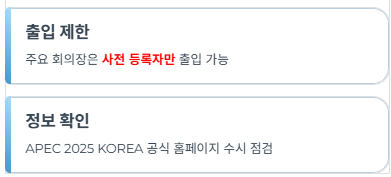 - 행사장 접근 제한: 주요 회의장은 사전 등록자만 출입 가능