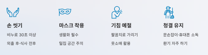 - 손 씻기 철저히, 마스크 착용, 기침 예절,