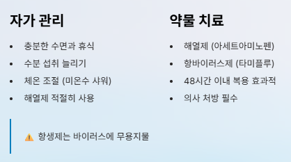 - 48시간 이내 항바이러스제 복용 시 회복 속도 향상 가능(의사 처방 필요).