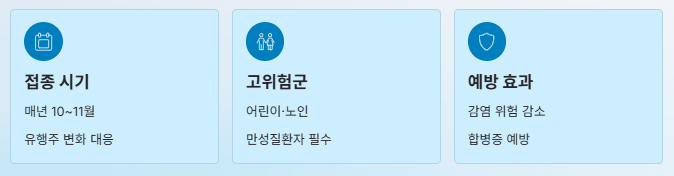 - 고위험군(어린이, 노인, 만성질환자)은 반드시 접종 필요