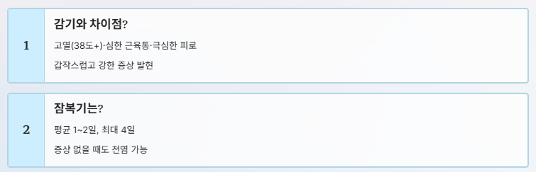 - 기침, 인후통, 콧물은 감기와 유사하지만, 독감은 증상 발현이 갑작스럽고 강도 높음.